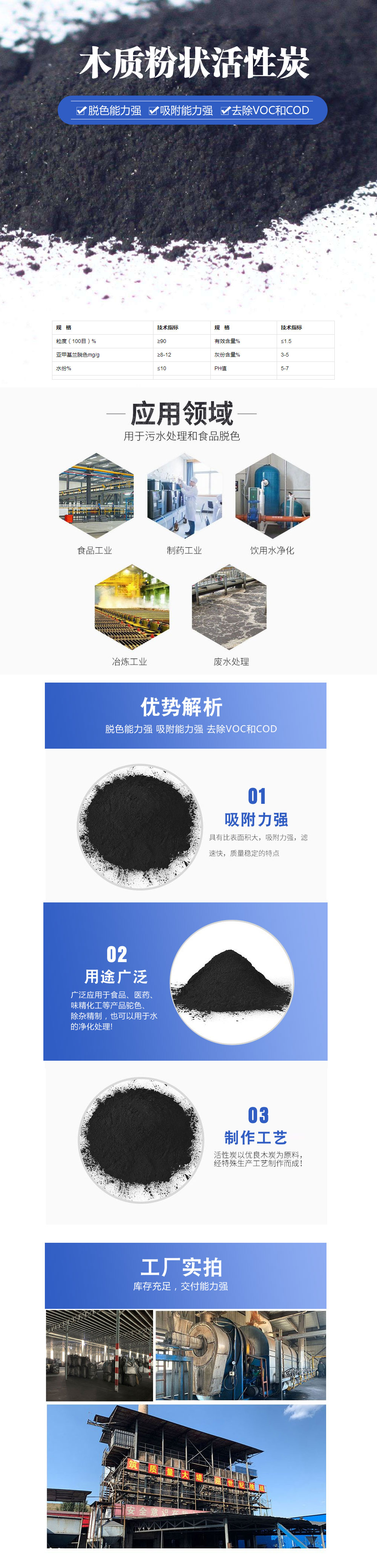 粉末活性炭以優(yōu)質(zhì)木屑、椰殼、煤質(zhì)為原料,經(jīng)系列生產(chǎn)工藝精加工而成。外觀呈黑色粉末或是微顆粒,產(chǎn)品廣泛應用于食品、飲料、醫(yī)藥、自來水、糖、油脂等行業(yè),在釀酒、污水處理、電廠、垃圾焚燒、電鍍等領(lǐng)域應用也較為普遍。 粉狀活性炭的脫色率達76%,粉狀活性炭又被稱為粉末活性炭,按其材質(zhì)可分為煤質(zhì)粉狀活性炭、木質(zhì)粉